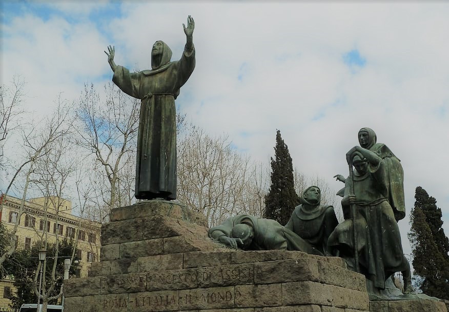 Buscad el monumento de San Francisco de Asís frente a la basílica a unos 200 metros. Haced una foto desde detrás suya mostrando sus manos “sujetando” la basílica. Eso es la idea de la estatua: San Francisco mantuvo viva la iglesia con su vida, moralidad y trajo frescura.